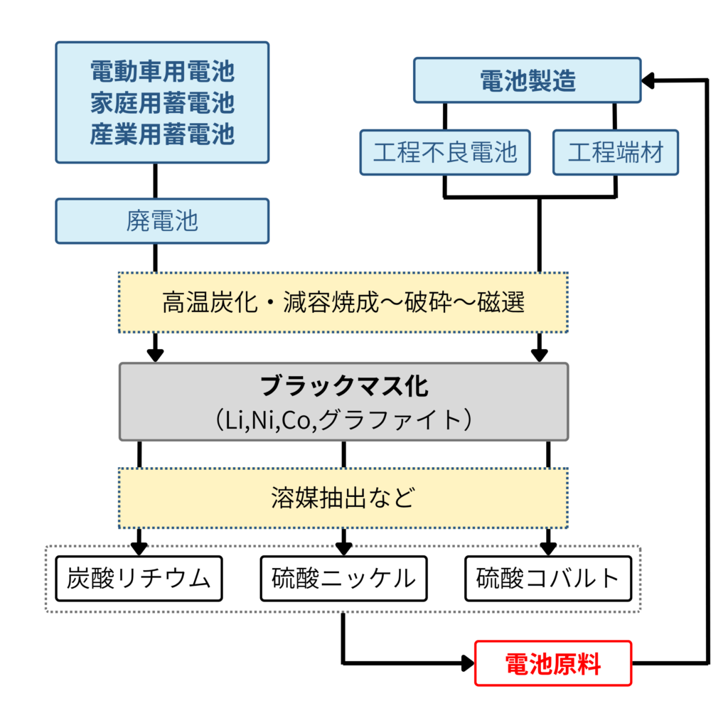 図1 電池素材のブラックマス化と元素分離プロセス例(筆者作成)