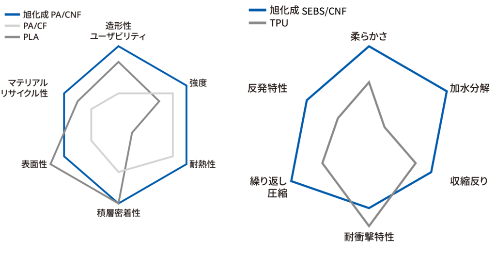 ▲旭化成の開発したPA/CNFの特性(左図)およびSEBS/CNFの特性(右図)