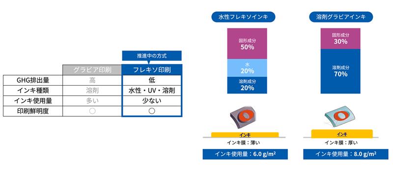 ▲溶剤を使うグラビア印刷と、水現像(水性)フレキソ印刷の比較