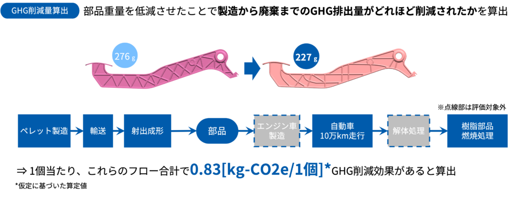 野本「最適化モデルを実際に成形するには、樹脂の複雑な力学特性や成形挙動を考慮することも非常に重要で、CAEと旭化成の知見を駆使して設計の信頼性を高めるとともに、試作回数を減らして開発期間を短縮します。試作回数を減らして部品を軽量化すると、ダイレクトに材料使用量の削減につながります。さらに部品の軽量化によって、どれほどGHG排出量の削減効果があるかをライフサイクルアセスメント(LCA)という手法を用いて算出できます。」