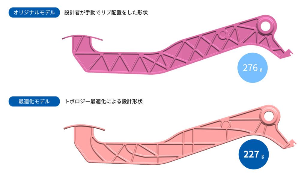 野本「トポロジー最適化は、構造を最適化する自由度がとても高くて、人ではちょっと思いつかないような革新的な構造を導き出してくれるのが特徴です。例えば自動車のペダル設計にトポロジー最適化技術を活用した例では(上図)、設計者が考えたオリジナルモデルをもとに、設計空間内の質量を最小化するリブ配置を探索して、剛性や強度は保ちながら材料使用量を約20%削減して軽量化を実現する、最適化モデルが導き出されました。」
