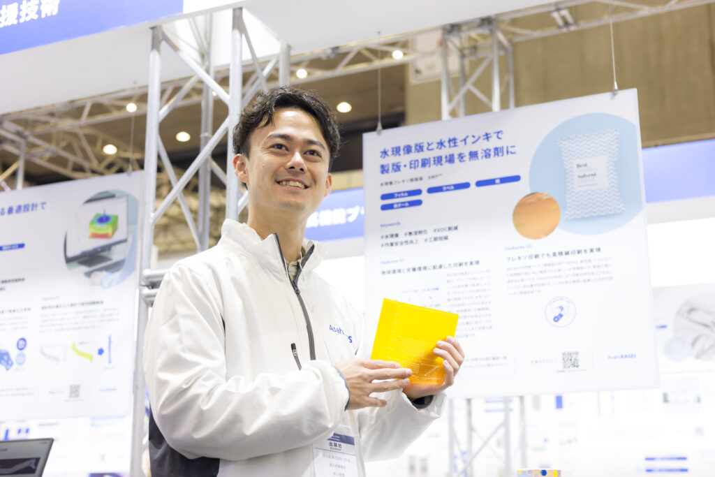 ▲SUSMA 2025旭化成ブースで水現像フレキソ樹脂版 AWP™のサンプルを手にした井川智博