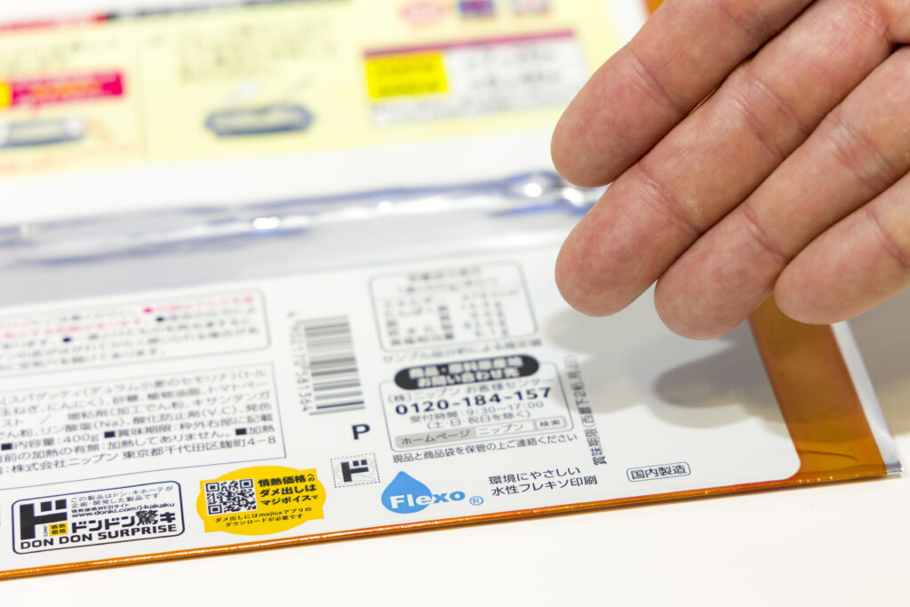 ▲「水性フレキソ印刷」の商品パッケージには、水性フレキソ促進業議会の水滴マークが付与されている