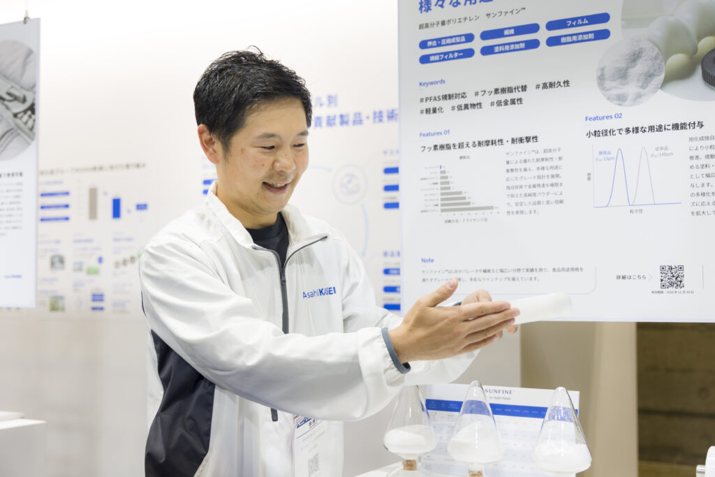 四方「今、サンファイン™は有機フッ素化合物の製造・使用・輸入などを制限するPFAS規制が強化される世界的な流れを受けて、将来的なフッ素樹脂の代替素材としても期待されています。今回のSUSMAでは、環境対応と高機能を両立するソリューションをご紹介し、お客様のご意見や用途のご要望を伺う場として出展しました。その結果、実際に塗料添加を試したいという具体的なご依頼もいただき、出展して本当に良かったと感じています。お客様からは、もっと小さくなれば用途が格段に広がる、という要望もいただいたので、さらなる小粒径化の開発を推進していきます。」