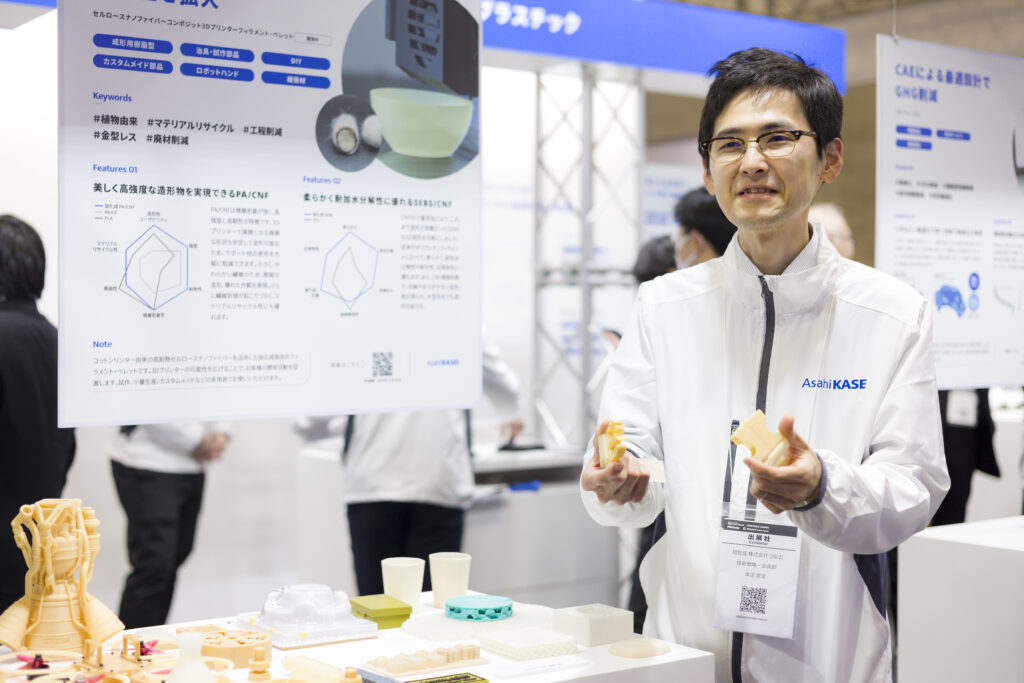▲ SUSMA 2025旭化成ブースで「PA/CNF」の成形品を解説する本庄崇文