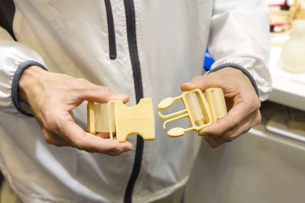 ▲PA/CNFの特性がわかる3Dプリント成形例(シートベルト)薄いリボン状のベルト部分も、複雑な形状のバックル部分もサポート材なしで造形することができる