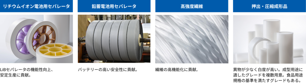 四方「サンファイン™は、レジ袋などに用いられる一般的なポリエチレンより分子量を高めた超高分子量ポリエチレンです。軽量で耐摩耗性・耐衝撃性などの優れた特質を持っていて、用途に応じて多様な分子量と粒子径でグレード設計ができます。原料は粉体状で、金属、コンクリート、その他プラスチックに代わる素材として、さまざまな形状に成形して使用されています。リチウムイオン電池や鉛蓄電池のセパレータをはじめ、防弾チョッキや船舶係留ロープなど、高強度繊維の原料としても幅広く採用されています。」