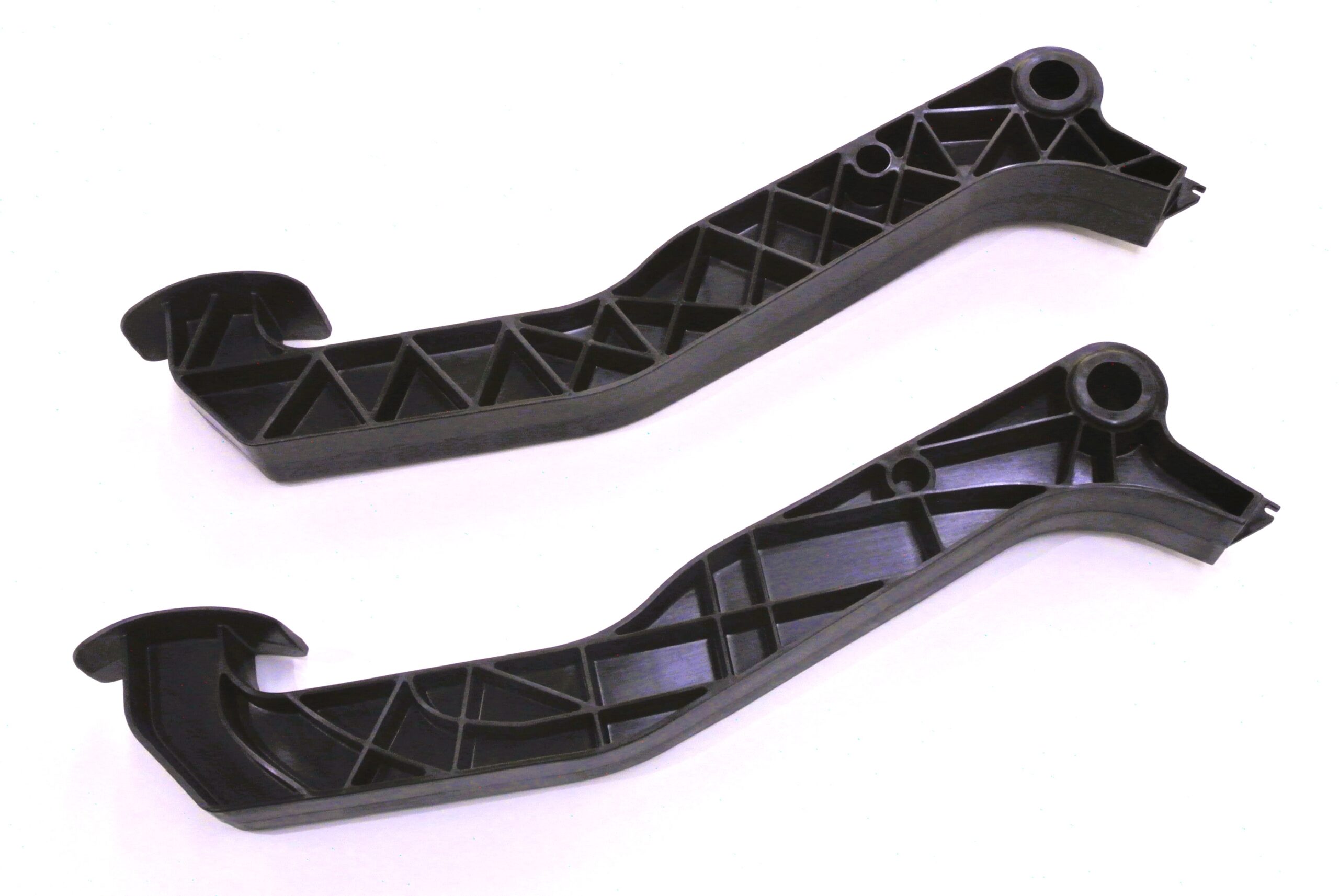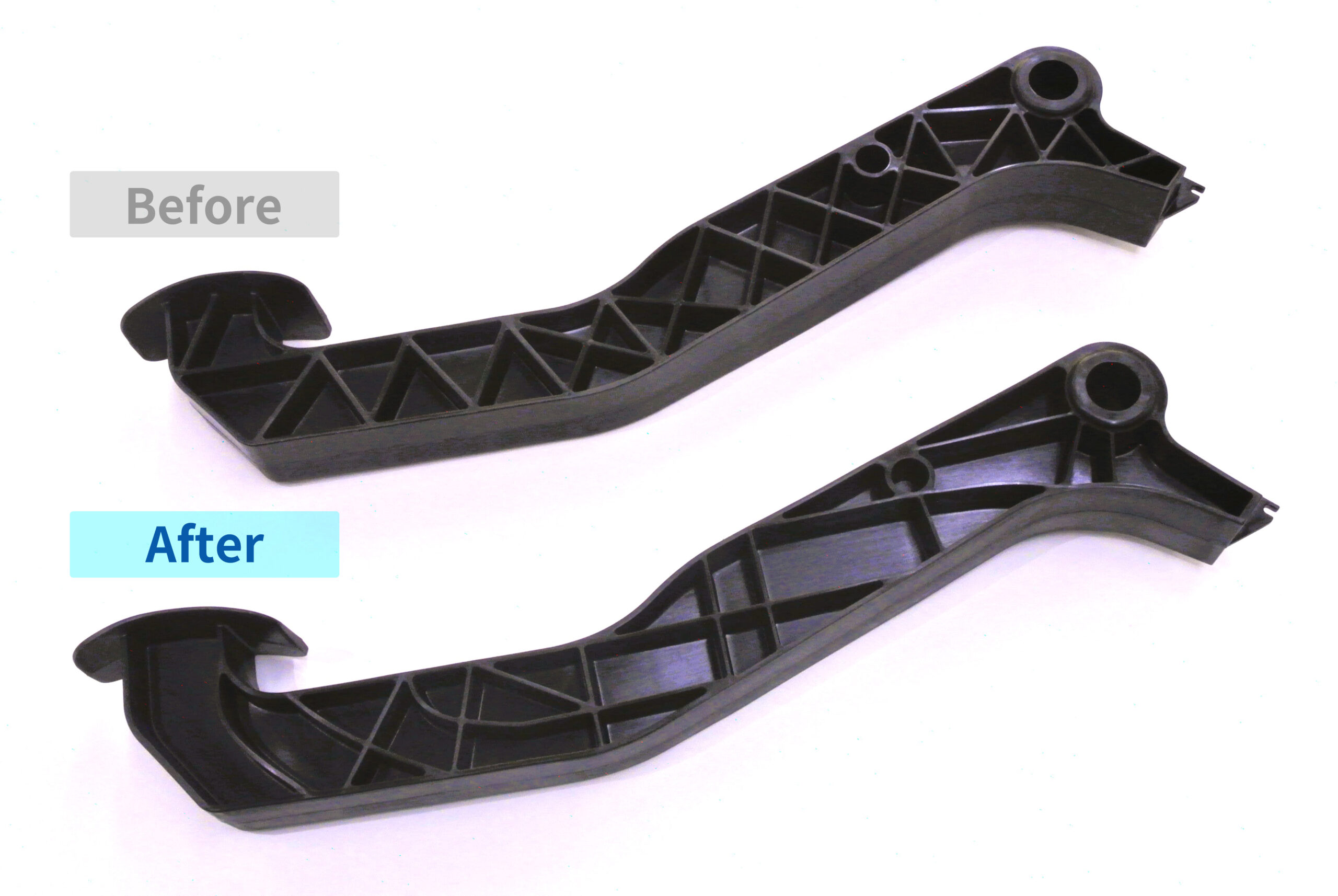 トポロジー最適化を活用し、従来のペダル形状を約20%軽量化しました。同じポリアミド66-GF35の樹脂を使用しながらも、構造を最適化することで大幅な軽量化が可能になります。本事例では1個あたり0.83kgのCO2削減が見込まれ*、数万点単位で量産されることを考慮すると、削減量は非常に大きいといえます。軽量化による燃費性能向上に加え、環境負荷低減にも大きく貢献する設計事例です。