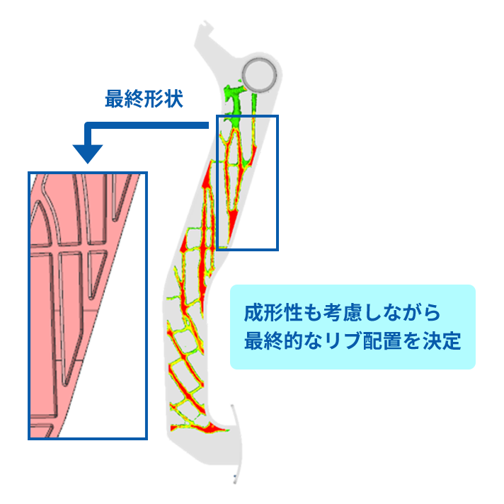 トポロジー最適化*を活用し、高剛性かつより軽量な形状をご提案します。さらに材料知見を活用し、射出成形可能な形状へ落とし込みます。素材もCO2もムダなく、最適でサステナブルな製品づくりを支えます。
