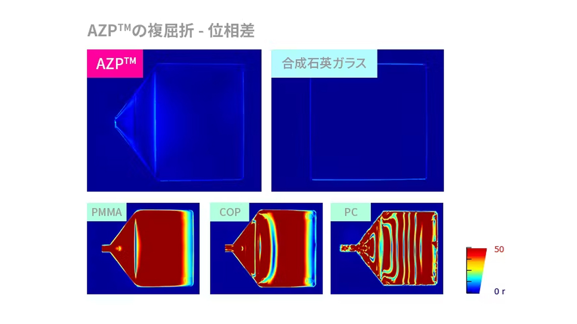 AZPは独自のポリマー設計により複屈折を限りなくゼロに抑えた光学樹脂です。また応力がかかった状態でも低複屈折性を保ち、自由な製品設計を可能にします。