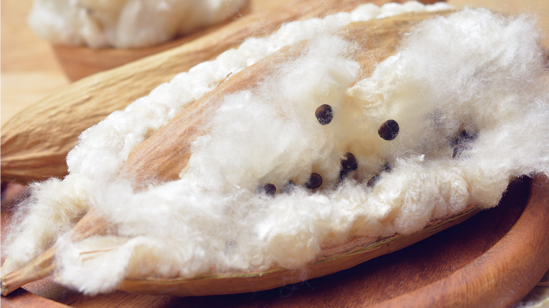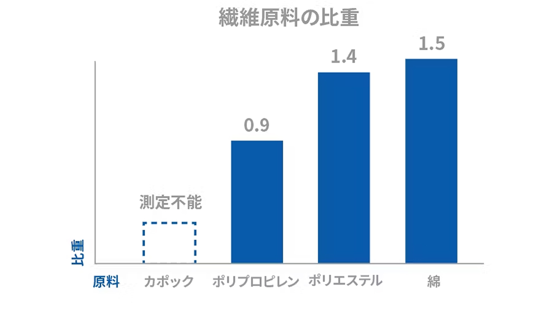 原料の1つであるカポック繊維の繊維比重は0.05以下と言われており、合成繊維(約1.0以上)と比べると軽量です。