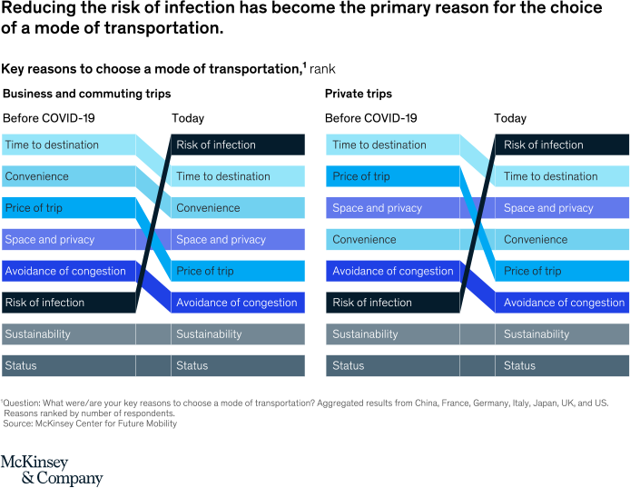 現在も続く世界的なパンデミックは、依然として人々をシェアードモビリティから遠ざけ続け、業界に影響を与えています。2020年12月のMcKinsey調査(2)では、「感染リスク」が、旅行と出張の両方の交通手段の選択において影響を及ぼす最大の関心事であるとしています。