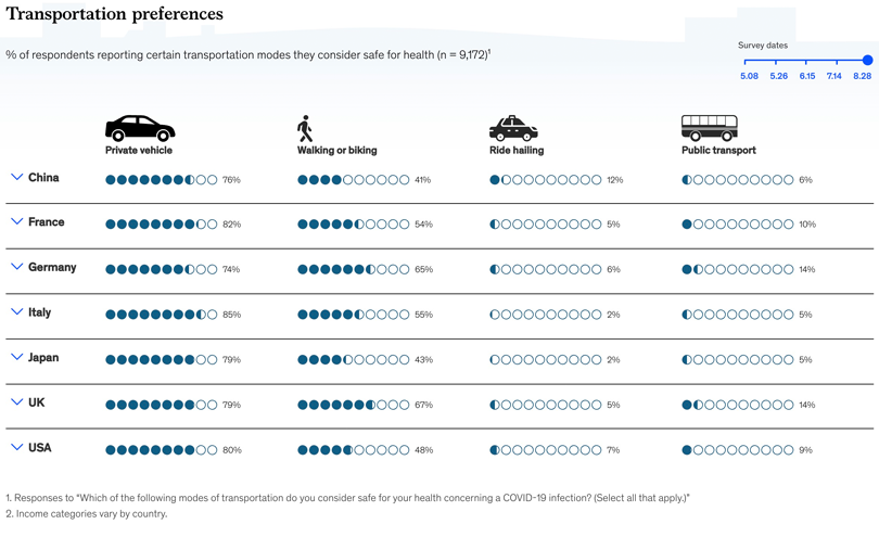 このパンデミックは、シェアリングサービスを敬遠する消費者を増やし、新車や中古車の需要が増加するという大きな変化をもたらしました。2020年8月のMcKinsey調査(1)では、公共交通機関とシェアードモビリティが、最も”安全性”の低い交通手段と見られています。一方、自家用車は車両に乗る人を自分で管理でき、車内の清潔さも確保できるので、最も”安全”な選択肢とされています。